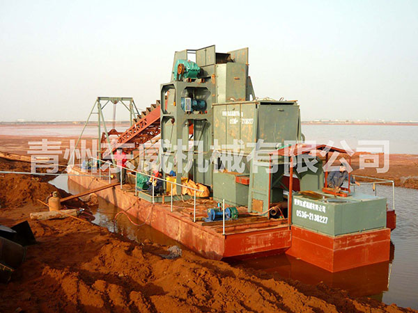该设备为分体、链斗式挖掘机械,浮体采用横骨架式分体箱形结构,装有定位锚设备、链斗挖掘装置、桥架升降装置、物料搅拌装置、物料输送泵组等。水下杆是由安装在浮体上的绞车实现升降,物料通过链斗装置挖掘上来进入搅拌机充分搅拌后用渣浆泵输送到指定区域。