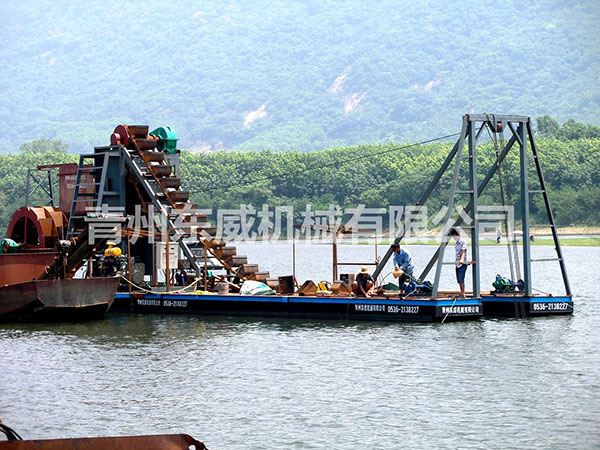 链斗式挖沙船可根据客户性能要求及工矿作业特点设计制造。物料挖掘出来并由输送机或输送泵输送至岸边、运沙船的功能;浮体采用横骨架式分体箱形结构,转运时可拆装后装车。装有定位设备、链斗挖掘装置、桥架升降装置及皮带输送机等。水下杆是由安装在浮体上的绞车实现升降,砂石料通过链斗装置挖掘上来,由输送机或输送泵输送到岸上或运沙船。